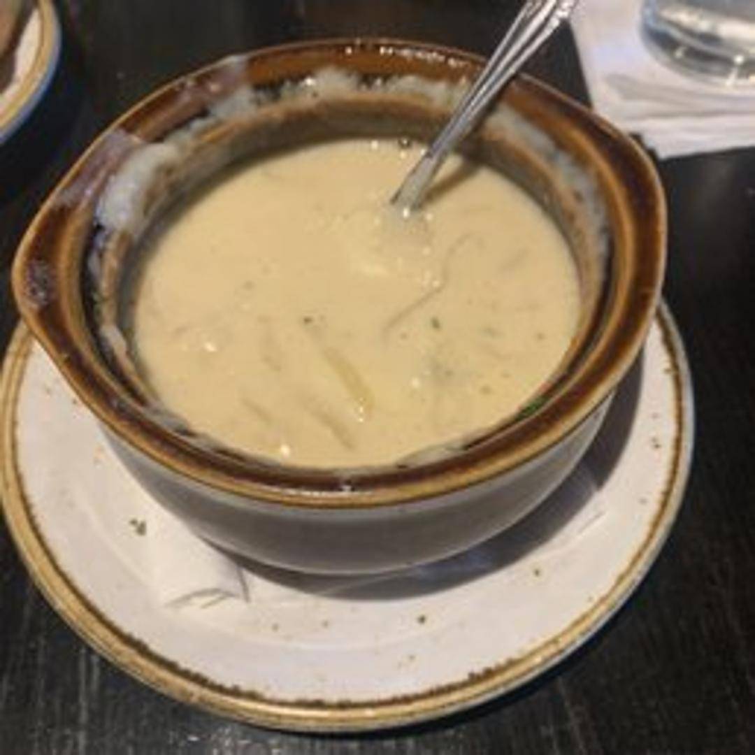 A rich and creamy onion soup, topped with a melted cheese crouton.