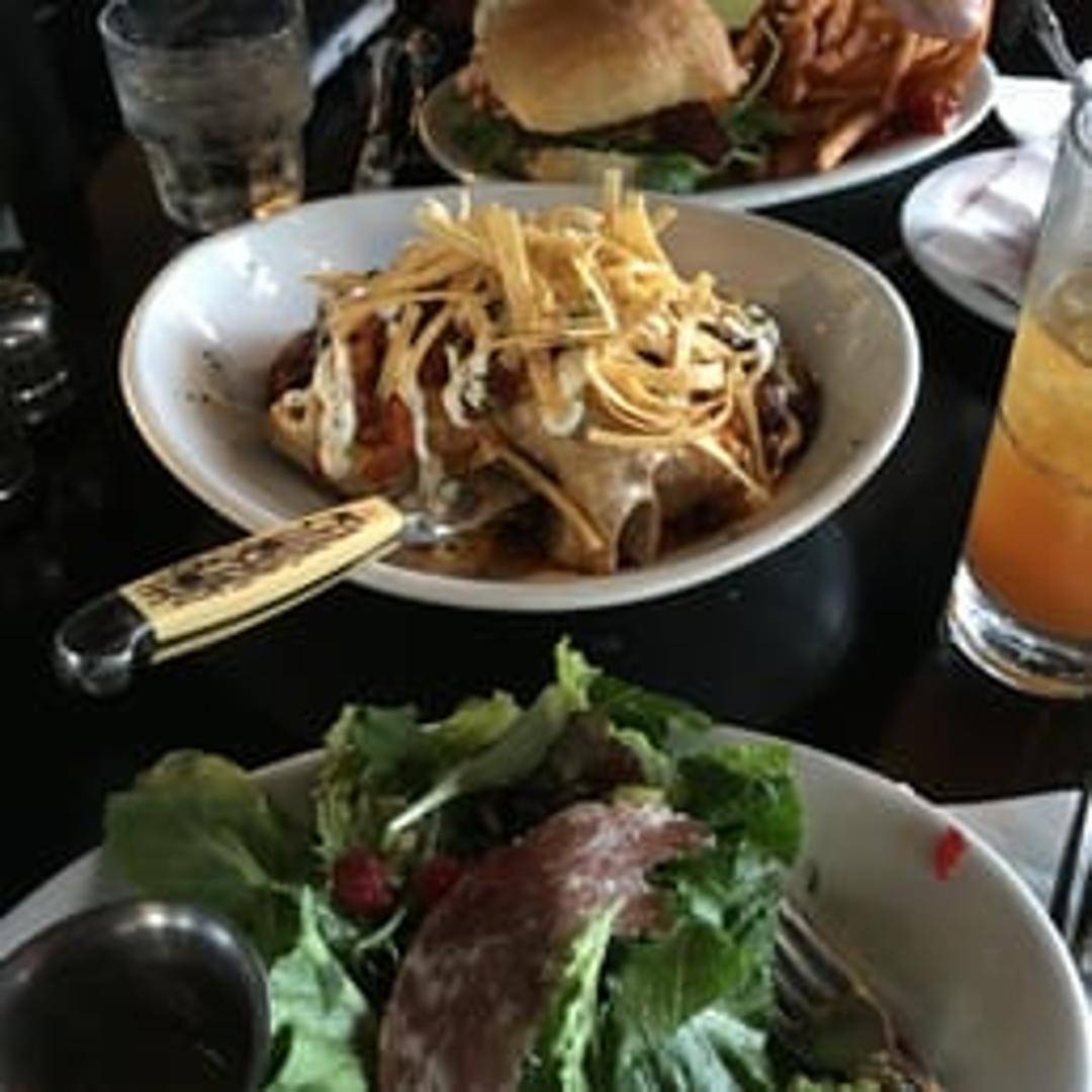 A large flour tortilla filled with roasted sweet potatoes, black beans, rice, corn, peppers, onions, and a blend of cheeses. Topped with a mild salsa and sour cream. Served with a side of tortilla chips.