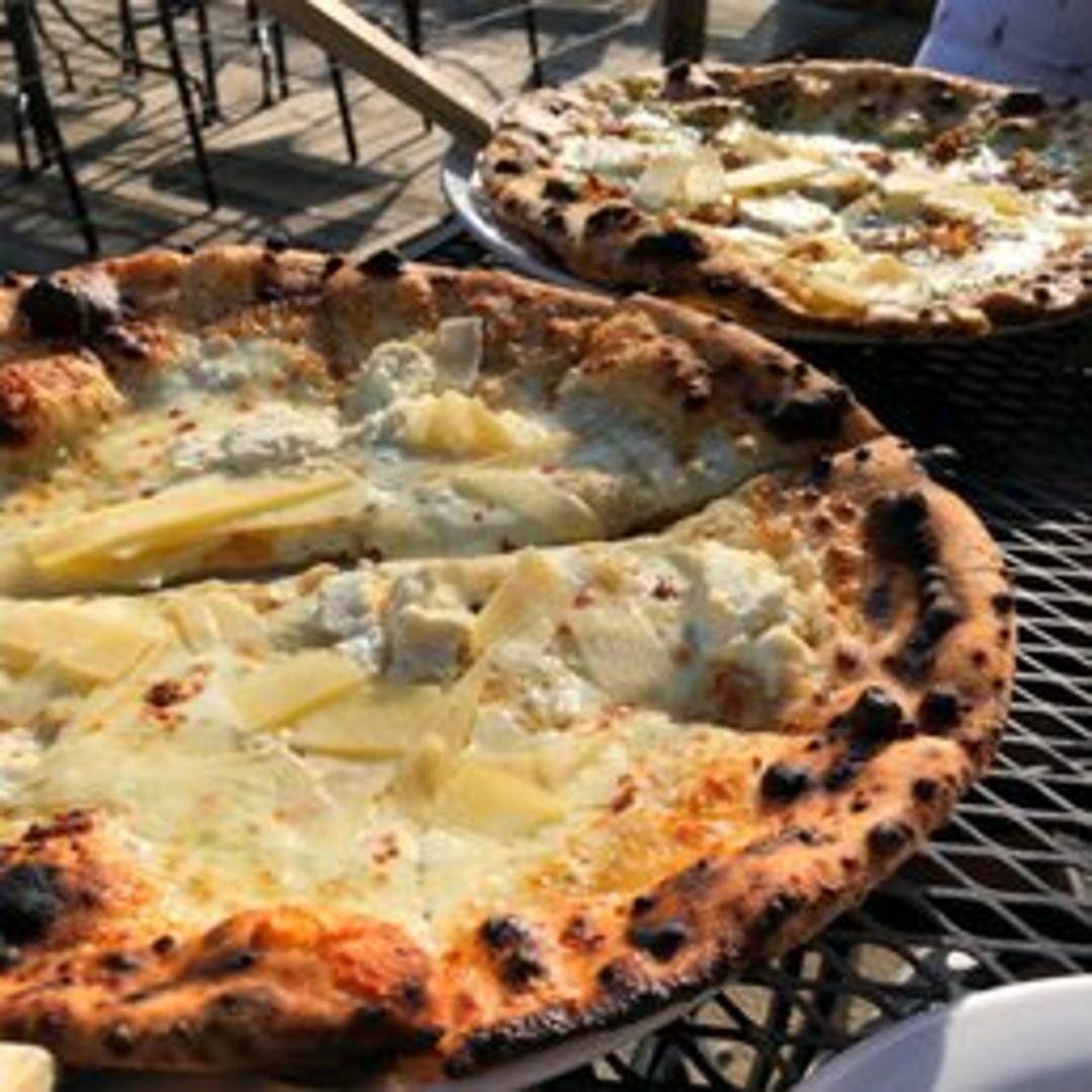 A white pizza featuring a blend of cheeses, often including ricotta, mozzarella, and Parmesan, seasoned with garlic, herbs, and olive oil. Typically without tomato sauce.
