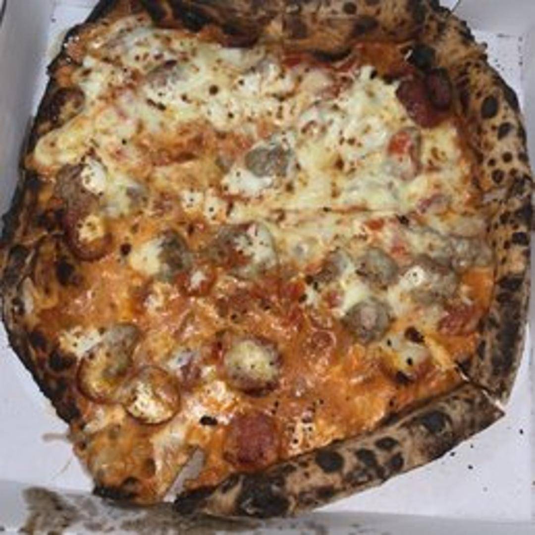 A pizza topped with San Marzano tomato sauce, mozzarella, sausage, pepperoni, and basil.