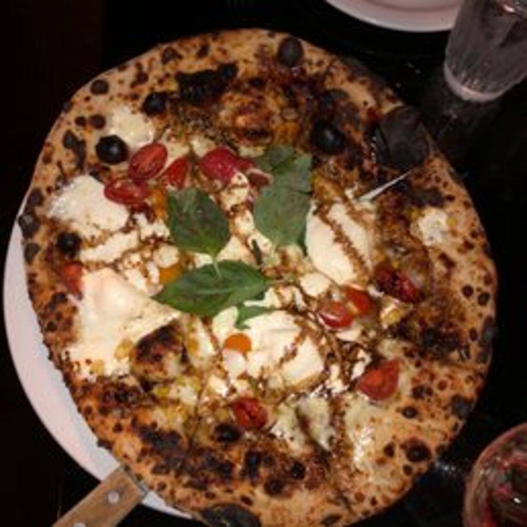 Pizza topped with San Marzano tomatoes, fresh basil, creamy burrata cheese, garlic, and olive oil.