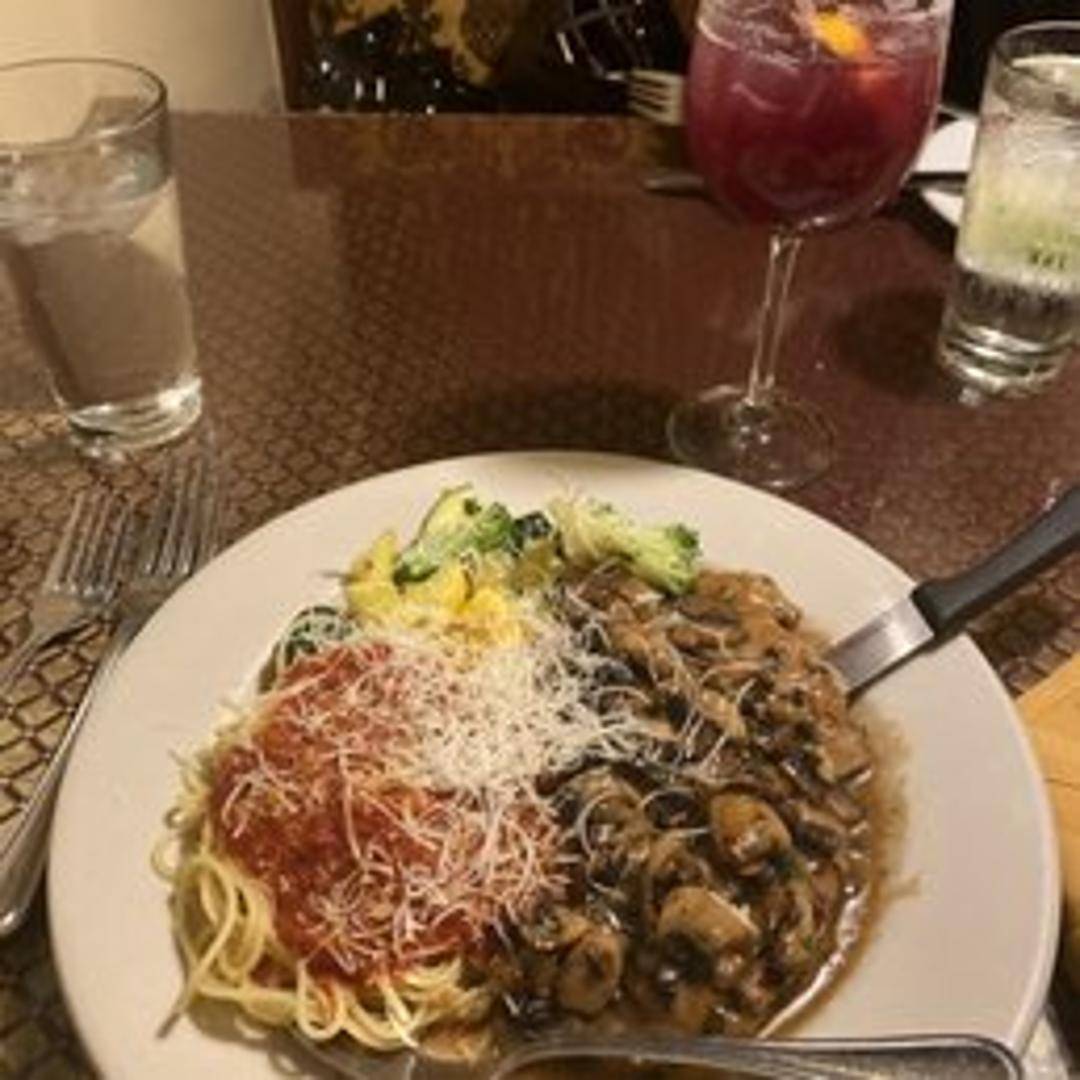 Sautéed chicken breast in a rich Marsala wine sauce with mushrooms, served with a side of spaghetti.