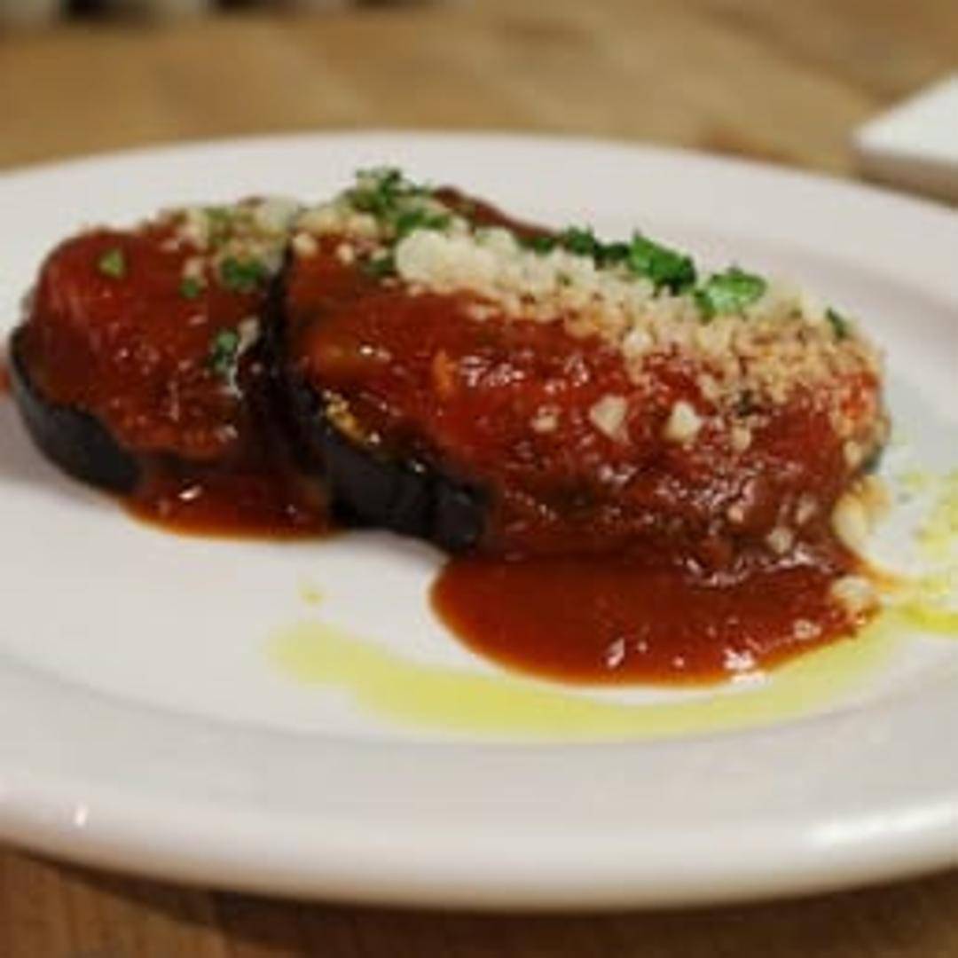 Classic eggplant parmesan. Breaded eggplant baked with marinara sauce and melted parmesan cheese. Served hot.