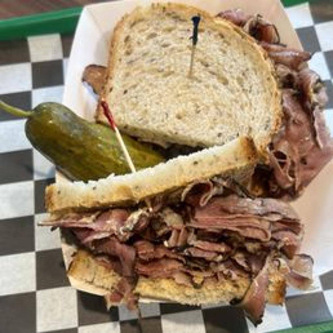 A piled-high sandwich of hot, tender, and flavorful pastrami. Served on rye bread, often with mustard.