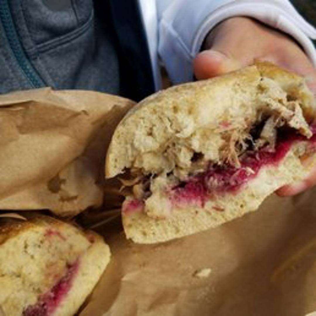 A festive sandwich featuring roasted turkey, cranberry sauce, savory stuffing, and a touch of mayonnaise, all piled high on your choice of bread. A taste of Thanksgiving any time of year.