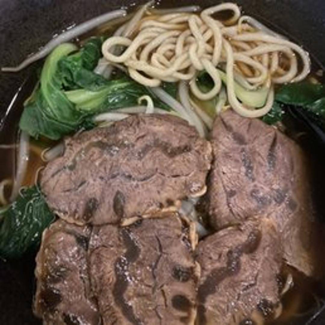A comforting noodle soup featuring tender shredded beef, wheat noodles, and a flavorful broth. Garnished with vegetables and herbs.