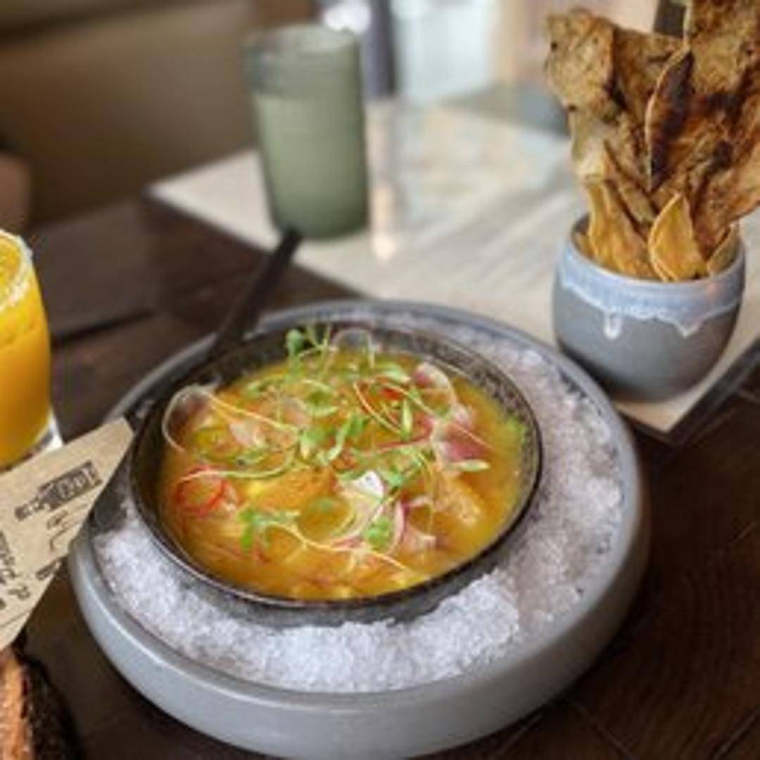 Fish marinated in a yellow pepper-based leche de tigre (citrus marinade), creating a vibrant and flavorful ceviche with a subtle heat.