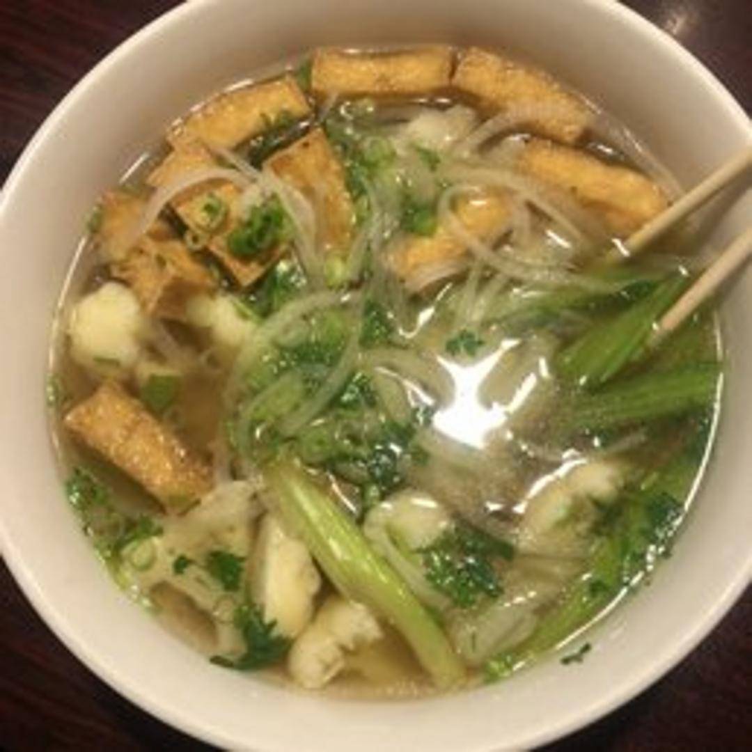 A delightful and aromatic vegetarian interpretation of the classic Vietnamese noodle soup. This nourishing bowl features a rich, flavorful vegetable broth, brimming with tender rice noodles, an assortment of fresh vegetables such as broccoli, carrots, mushrooms, and often includes firm tofu. Served piping hot and accompanied by a side of fresh herbs, bean sprouts, and lime wedges for a customizable and refreshing finish.