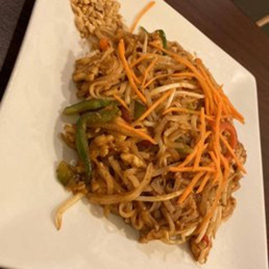 Indulge in Doan's classic Pad Thai, a beloved staple of Thai cuisine. This iconic dish features perfectly stir-fried rice noodles, tossed in a rich, tangy, and subtly sweet tamarind-based sauce. It's expertly prepared with scrambled egg, fresh bean sprouts, and scallions, then garnished with crunchy roasted peanuts and a fresh lime wedge, offering a delightful interplay of textures and balanced flavors in every forkful.