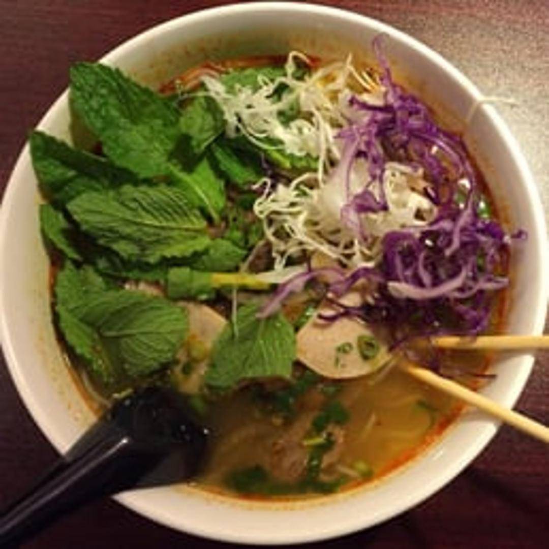 A robust and aromatic Vietnamese soup featuring a rich, deeply flavorful beef broth simmered with a blend of fragrant spices, delivering a satisfying level of heat. This hearty bowl includes tender slices of beef, thick rice noodles, and a medley of fresh herbs, offering a comforting and complex culinary experience.