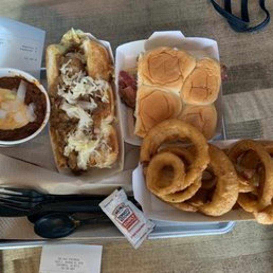 Bratwurst, caramelized onions, sauerkraut, spicy brown mustard.