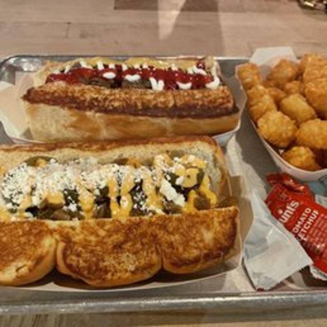 All beef dog, caramelized onions, chipotle aioli, pickled peppers, cotija cheese on a grilled King's Hawaiian roll.