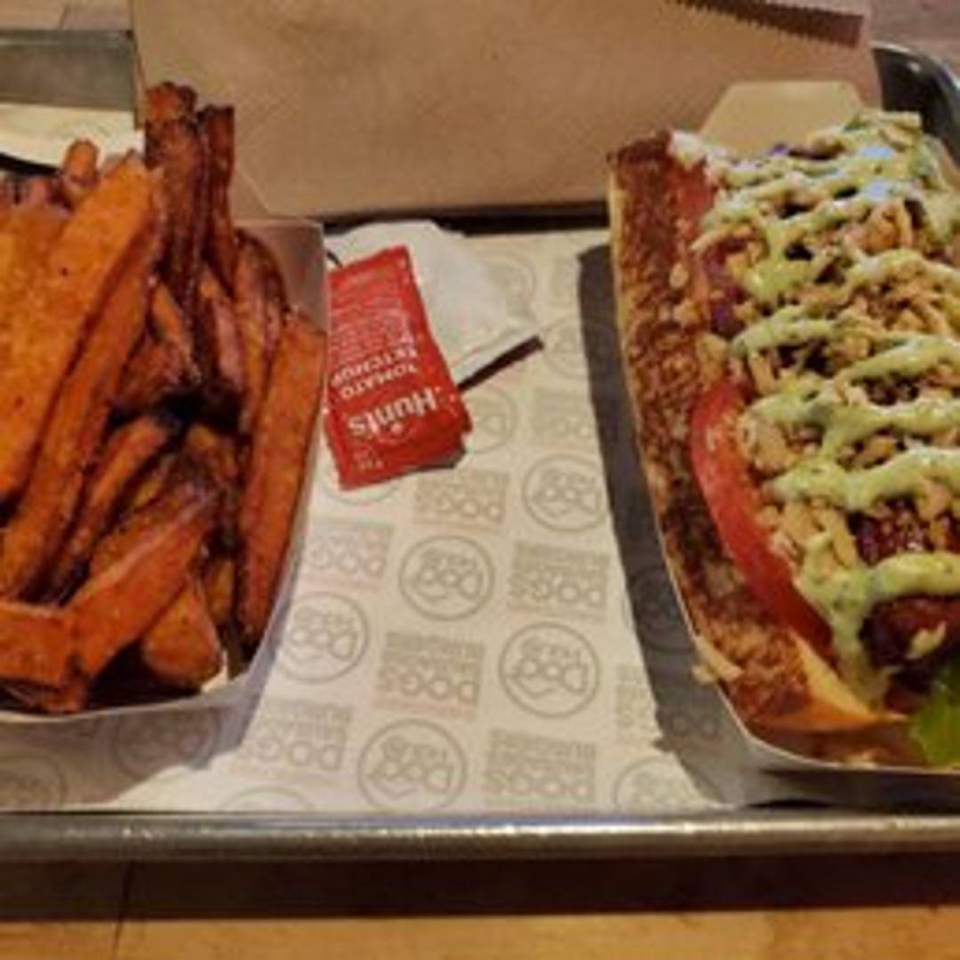 All beef dog, wild arugula, avocado, tomato, crispy onions, spicy basil aioli on a grilled King's Hawaiian roll.