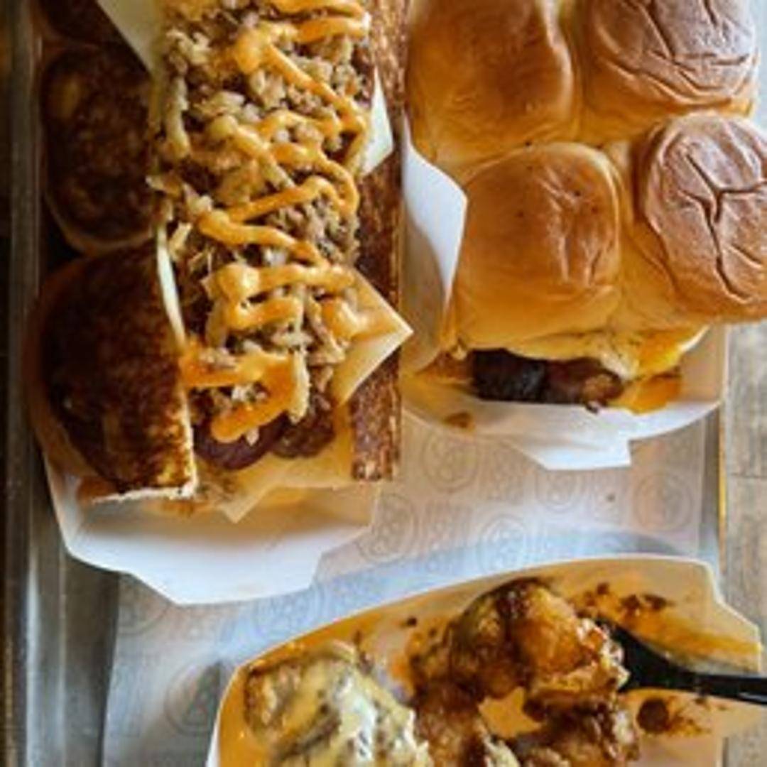 Angus beef patty, white American cheese, smoked bacon, fried egg, mayo, caramelized onions, and fries on grilled King's Hawaiian rolls.