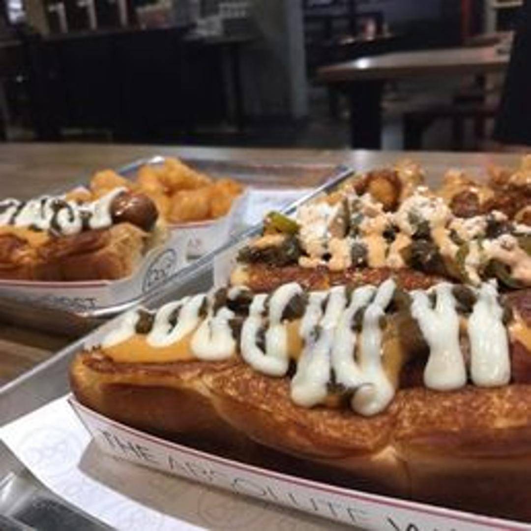 Italian sausage, mozzarella cheese, caramelized onions, bell peppers, marinara on a grilled King's Hawaiian roll.