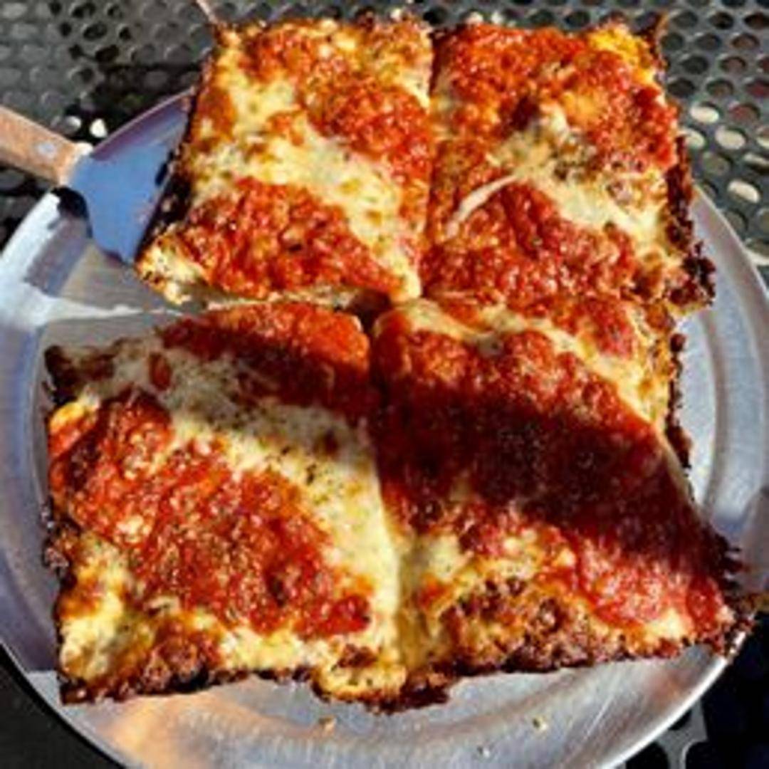 A thick, square-cut pizza with a fluffy, focaccia-like crust, topped with a rich tomato sauce, mozzarella cheese, and your favorite pizza toppings. A hearty and flavorful pizza option.
