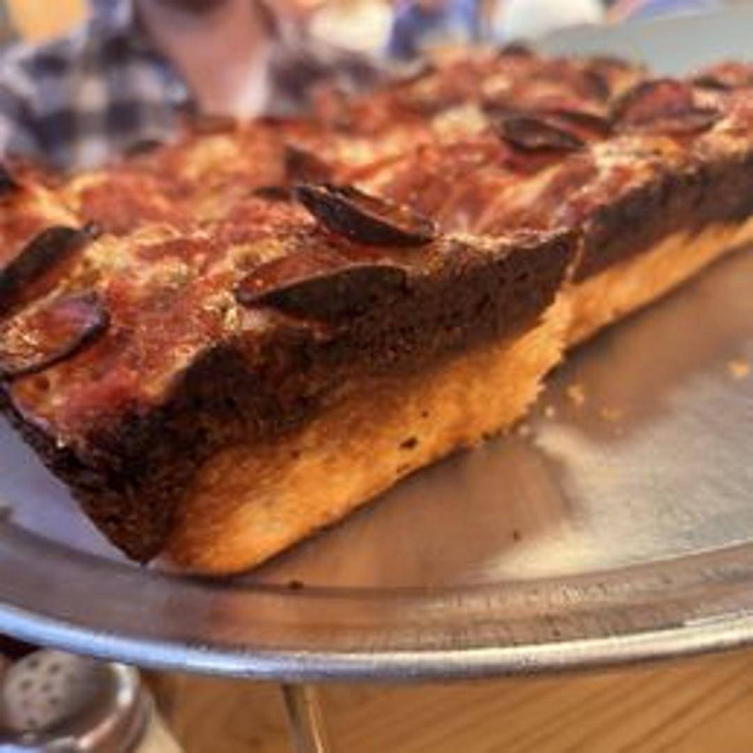 A large, thin-crust pizza made with hand-tossed dough, topped with a tangy tomato sauce, generous amounts of mozzarella cheese, and baked to a golden-brown crisp. Features a foldable, slightly chewy crust and classic New York-style flavor. Available by the slice or as a whole pie.