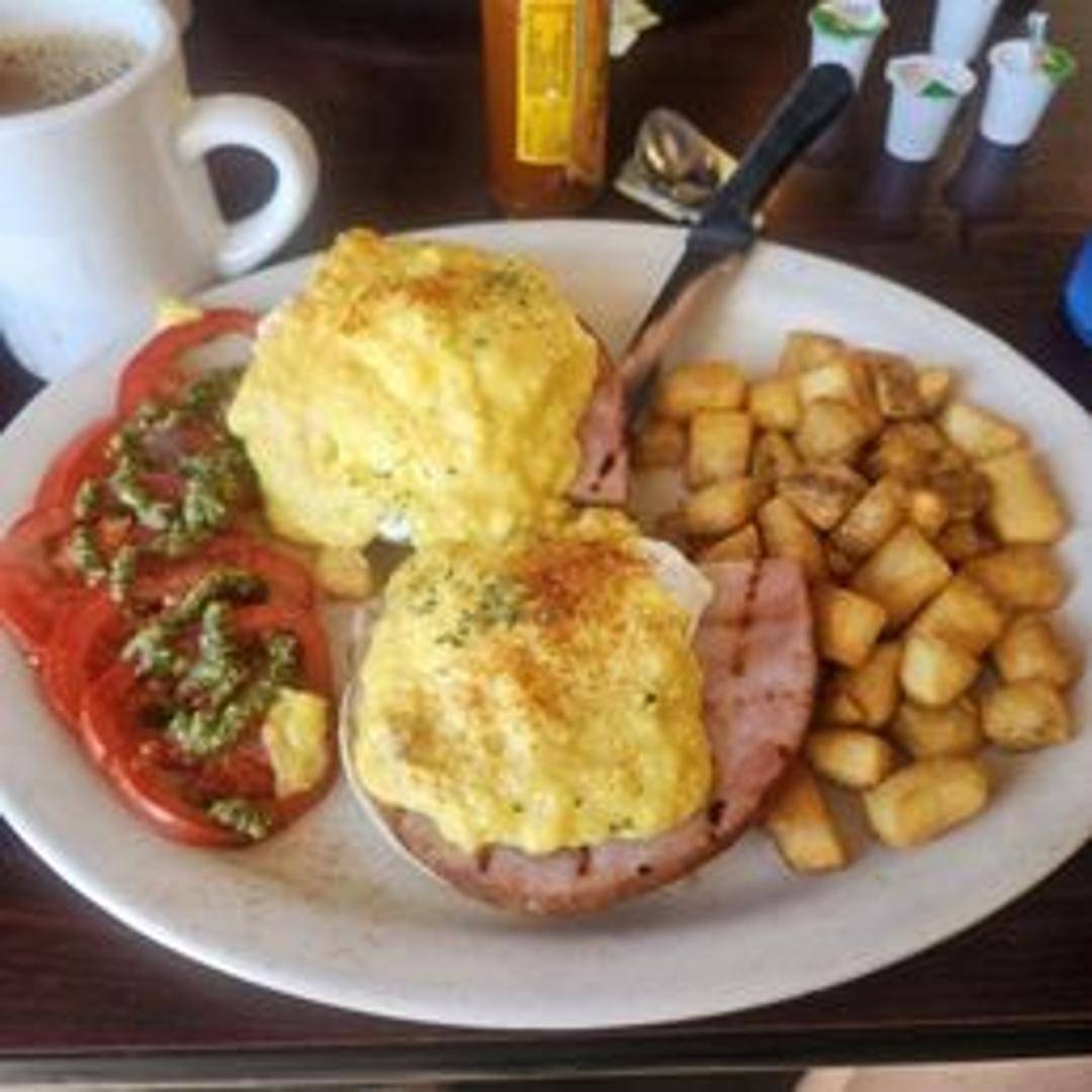 Two poached eggs served atop toasted English muffins with Canadian bacon and smothered in creamy hollandaise sauce. Served with your choice of side.