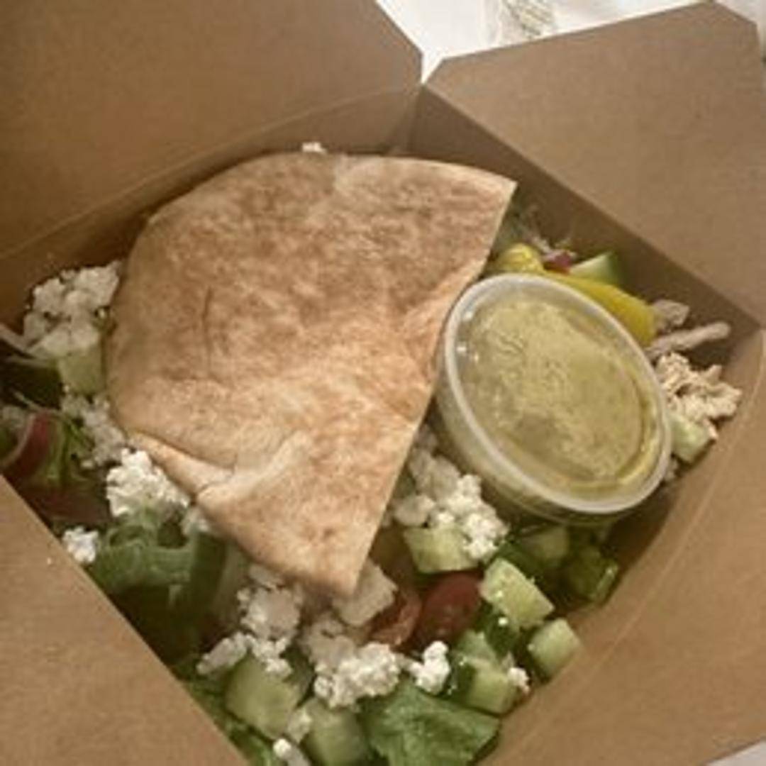 A refreshing salad featuring crisp romaine lettuce, juicy tomatoes, cucumbers, red onion, Kalamata olives, and feta cheese. Tossed in a tangy Greek vinaigrette.