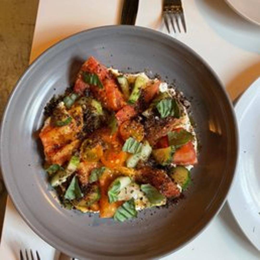 A colorful assortment of seasonal heirloom tomatoes, drizzled with balsamic glaze and topped with fresh basil and sea salt.