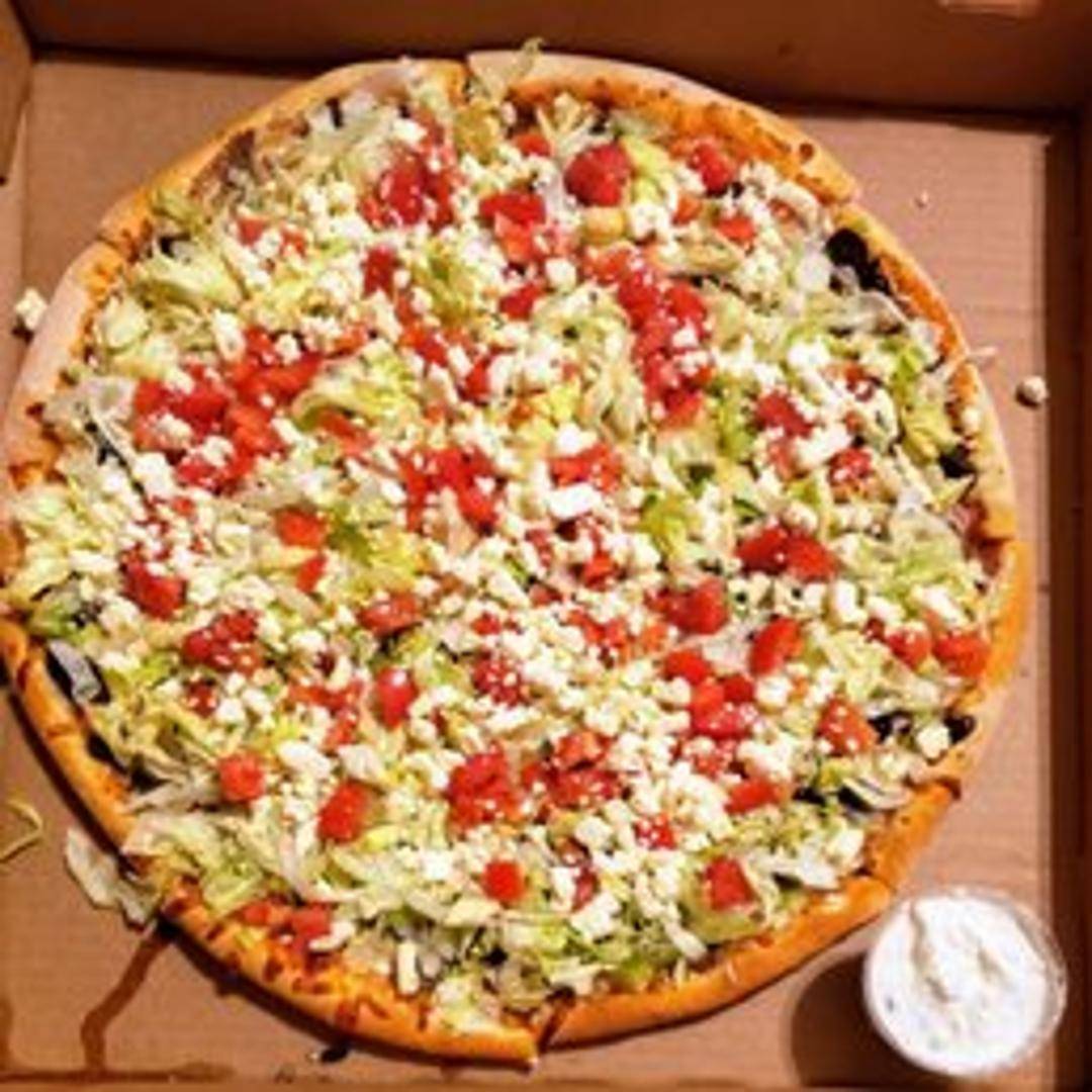 A Mediterranean-inspired pizza with a delicious blend of flavors. Topped with gyro meat, feta cheese, black olives, tomatoes, onions, and a drizzle of olive oil.