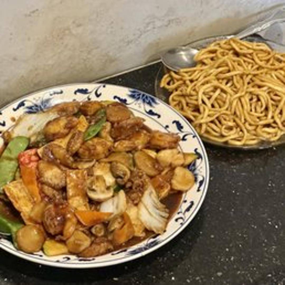 A medley of shrimp, scallops, and imitation crab meat stir-fried with a variety of fresh vegetables in a light, flavorful white sauce.