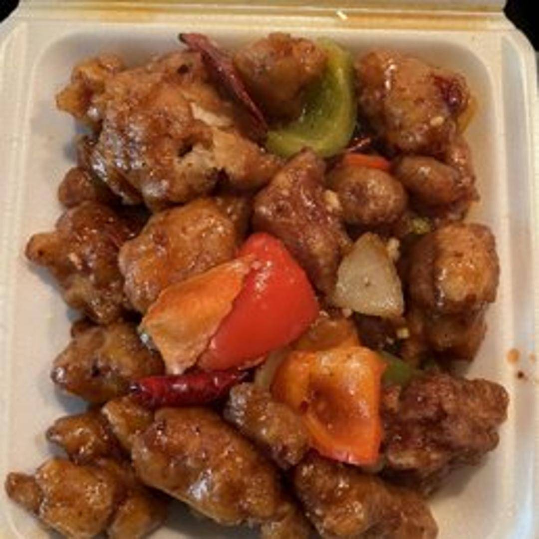 Crispy chicken stir-fried in a sweet and spicy General Tso's sauce with broccoli.