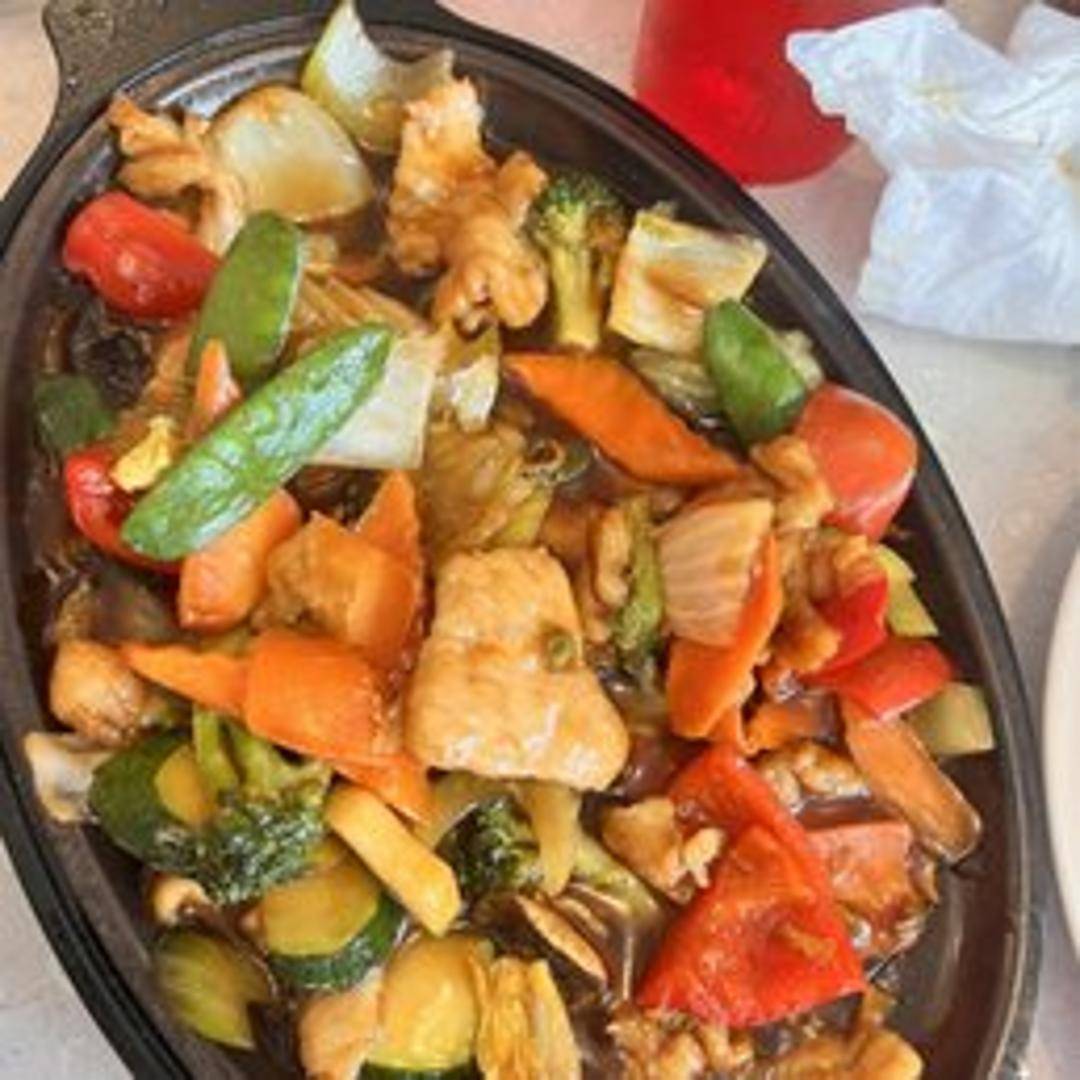 Crispy tofu stir-fried in a sweet and spicy General Tso's sauce with broccoli.