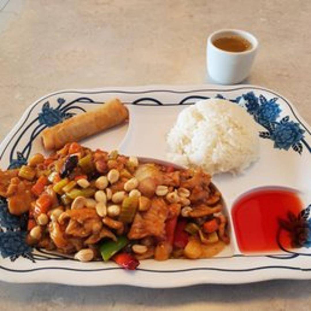 Diced chicken stir-fried with peanuts, dried chili peppers, and vegetables in a spicy and savory Kung Pao sauce.