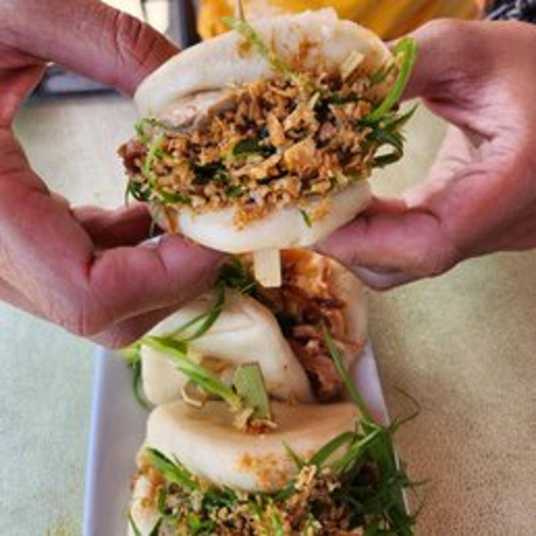 Tender and succulent roast duck nestled inside soft, steamed bao buns. Enhanced with hoisin sauce, thinly sliced scallions, and crisp cucumber for a delightful balance of flavors and textures.