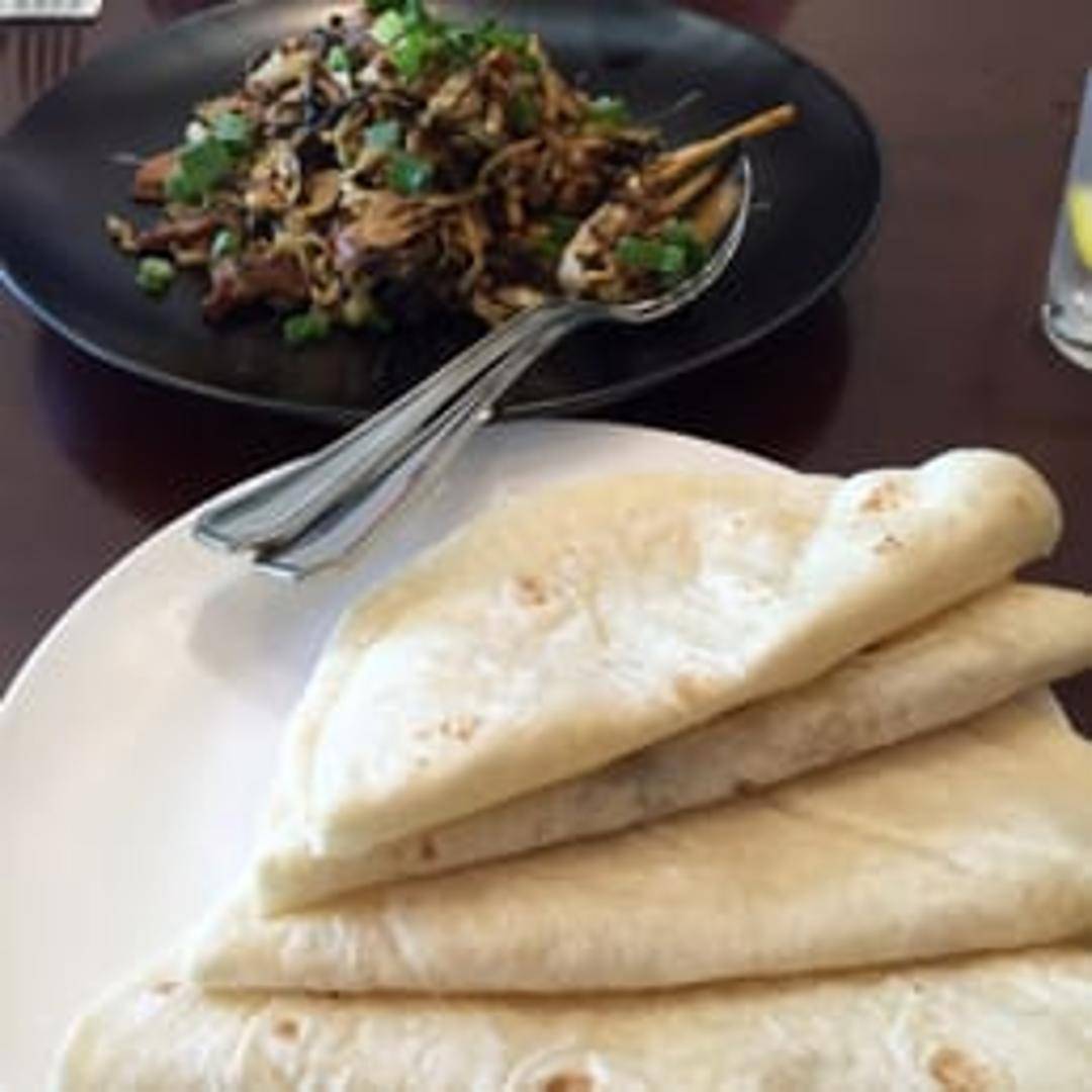 A savory stir-fry of shredded pork, scrambled eggs, and crisp vegetables like cabbage and mushrooms, served with thin Mandarin pancakes and plum sauce for wrapping.