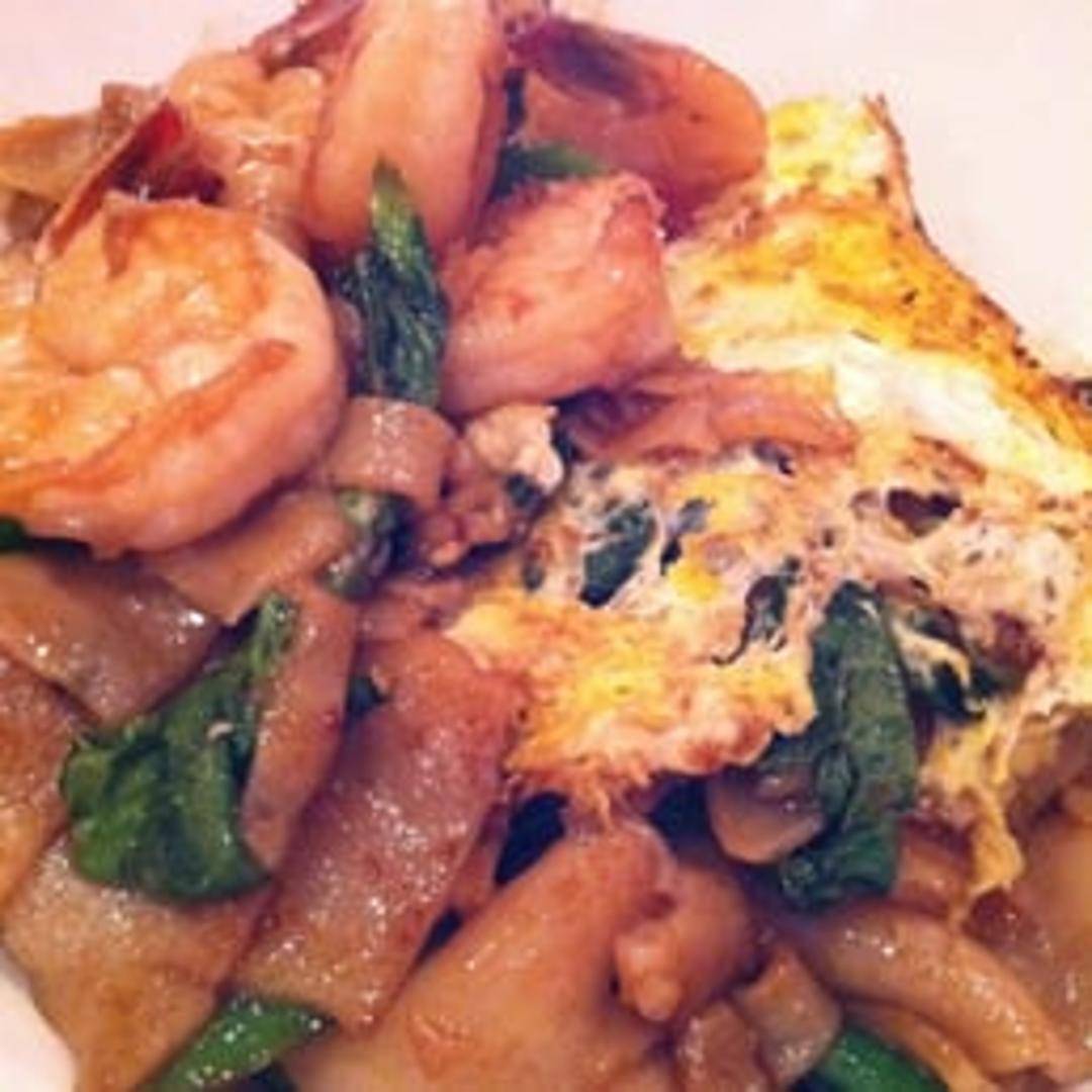A popular Thai stir-fried noodle dish featuring wide, flat rice noodles wok-tossed with Chinese broccoli, scrambled egg, and your choice of protein (chicken, beef, pork, or tofu). The dish is characterized by its savory, slightly sweet flavor derived from dark soy sauce and a smoky aroma from the high-heat cooking process.