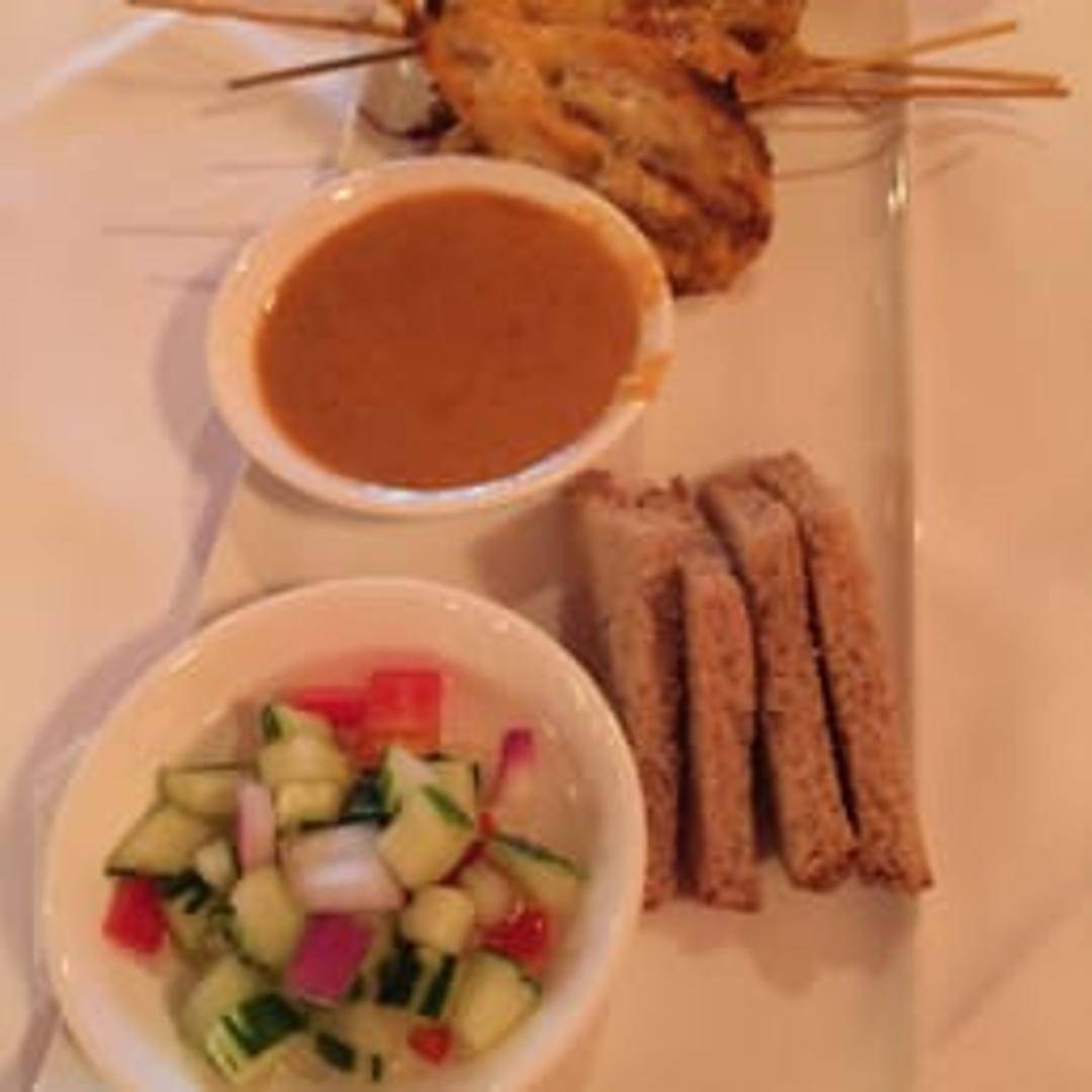 Marinated strips of tender chicken, skewered and grilled to perfection, offering a smoky and subtly spiced flavor. Each skewer is served with the classic duo of a rich and creamy peanut sauce for dipping, alongside a refreshing cucumber relish to cleanse the palate.