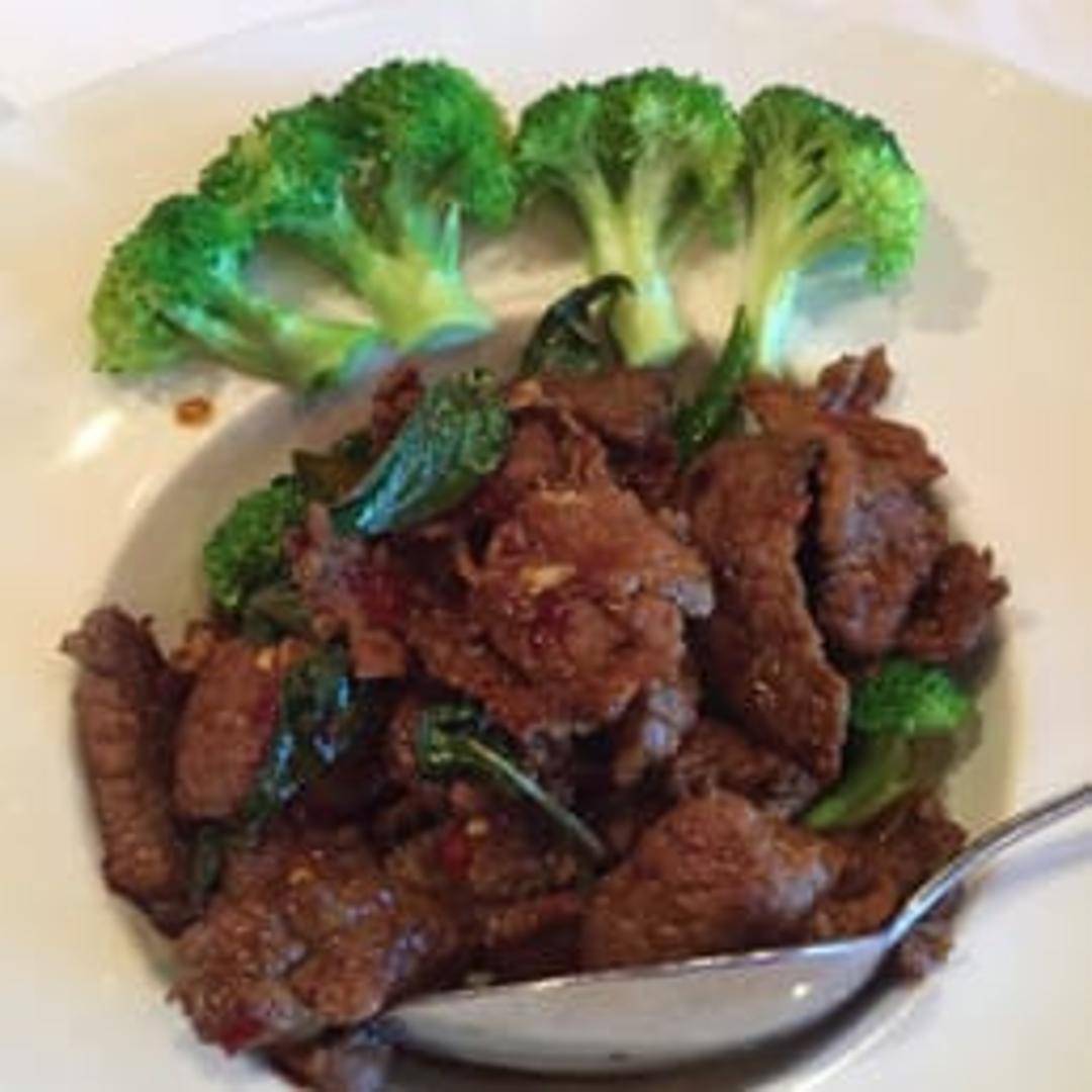 Tender slices of beef stir-fried with fragrant holy basil leaves, fresh chilies, garlic, and green beans, all coated in a savory brown sauce. This dish offers a harmonious blend of spicy, salty, and aromatic flavors, making it a beloved choice for those who enjoy bold and herbaceous Thai cuisine.