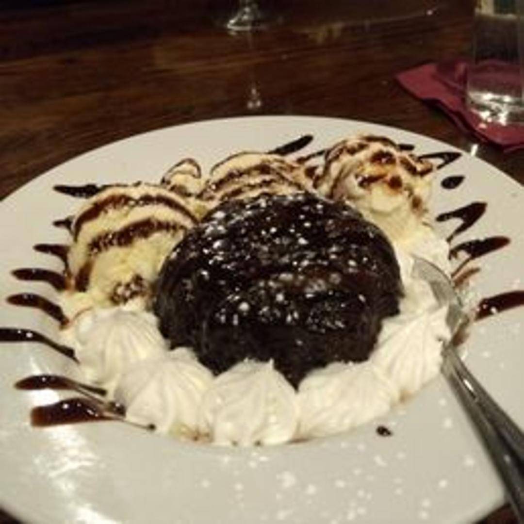 Individual molten chocolate cake with a warm, gooey center. Served with a scoop of vanilla ice cream and chocolate sauce.