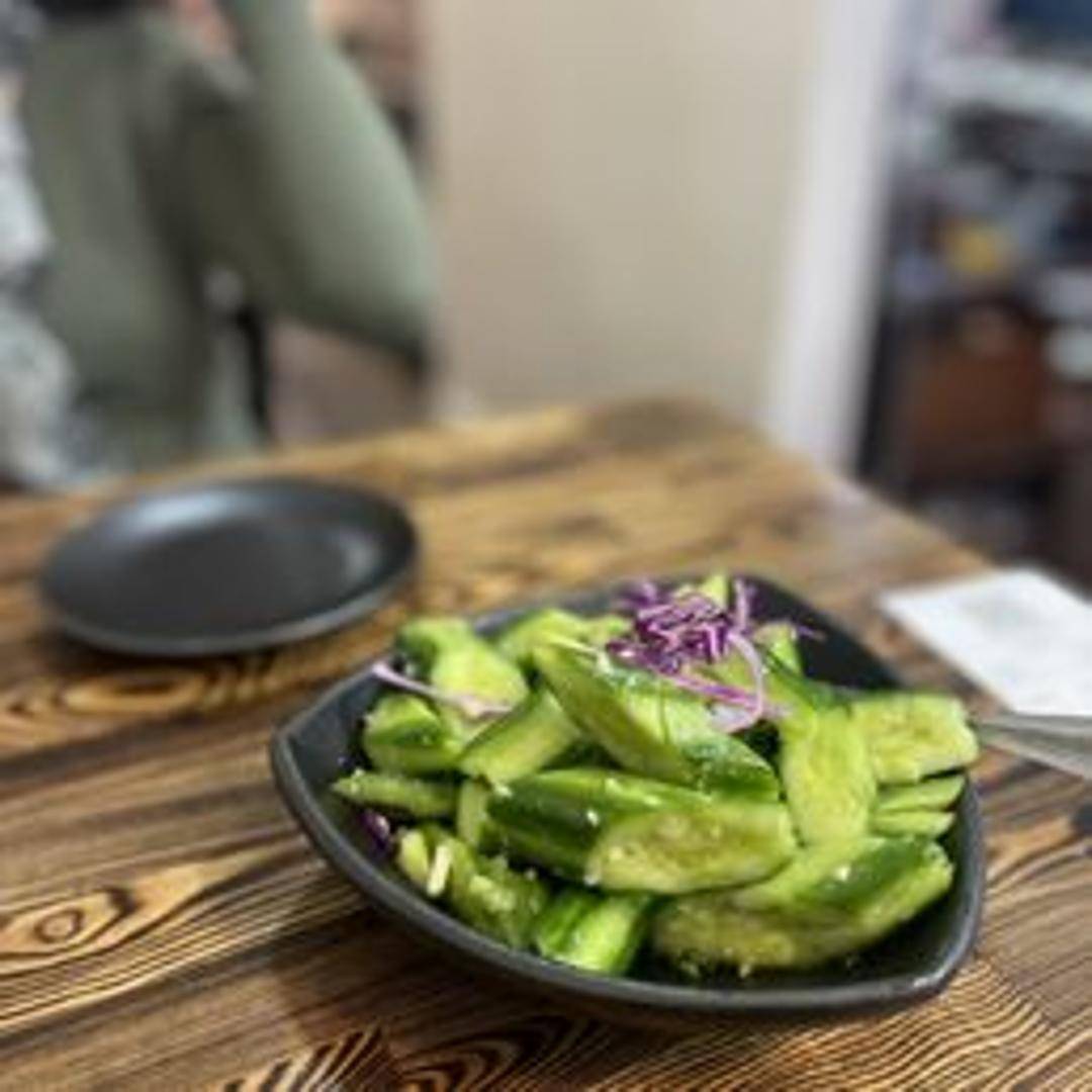 A refreshing and crunchy salad made with crisp cucumber slices tossed in a flavorful dressing. The dressing features crushed garlic, sesame oil, vinegar, and a touch of sugar, creating a savory, slightly tangy, and aromatic side dish.