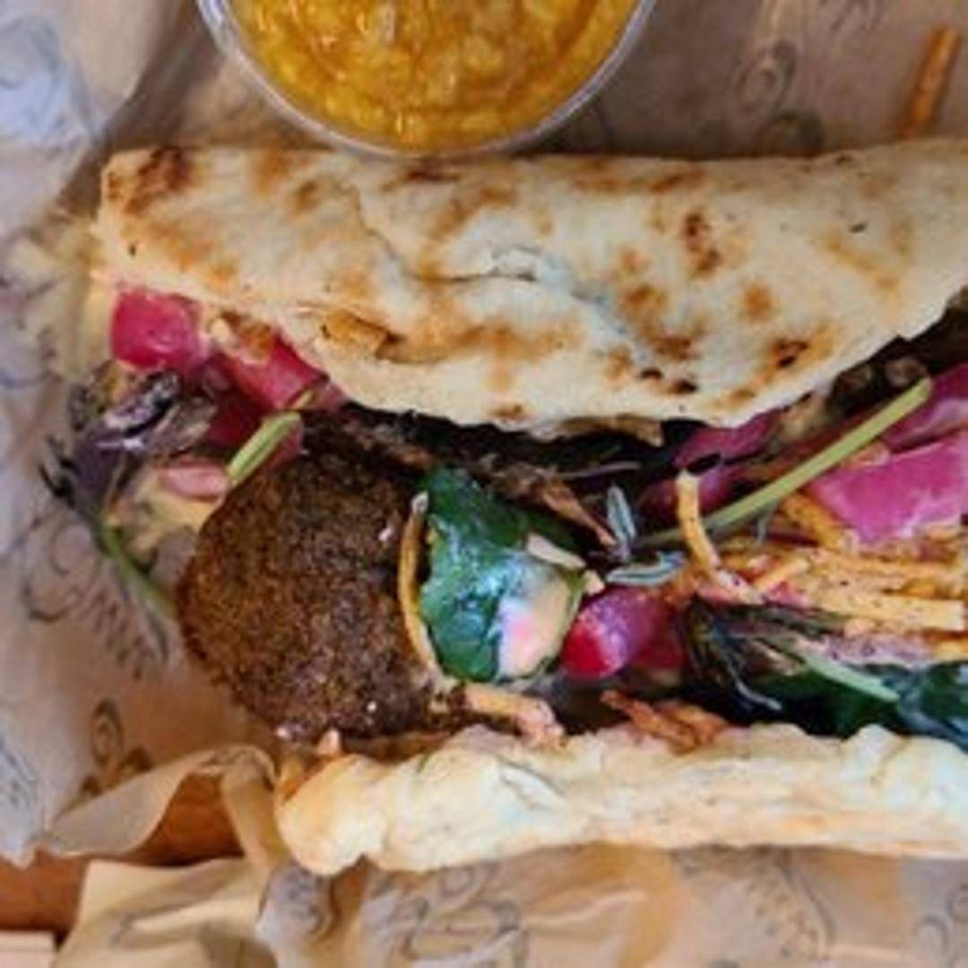 House-made falafel, hummus, pickled vegetables, tahini, and schug (spicy cilantro sauce) served in warm pita bread.