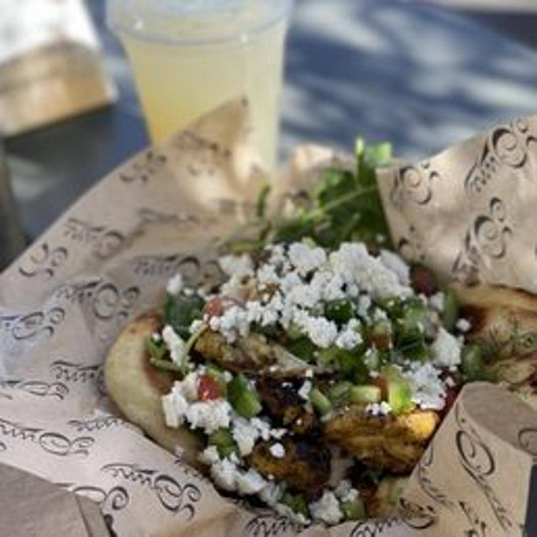 Grilled marinated chicken skewers, tzatziki sauce, tomato, onion, and herbs in warm pita bread.