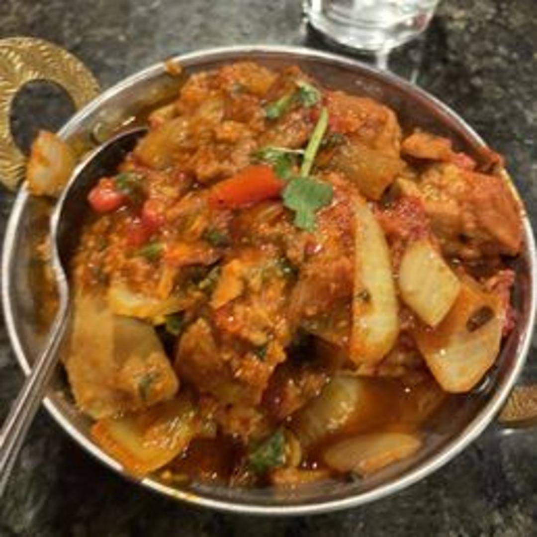 A flavorful dish cooked in a traditional Indian wok with bell peppers, onions, tomatoes, and a blend of aromatic spices.
