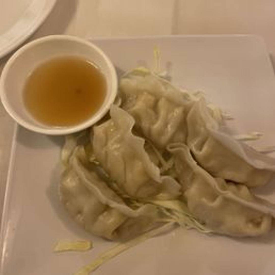 Pan-fried or steamed dumplings filled with a savory mixture of ground chicken and vegetables, served with a dipping sauce.