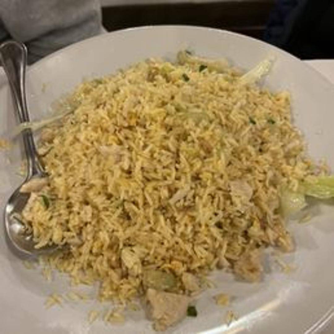 Savory fried rice with a unique flavor profile, featuring diced chicken and salted fish. A flavorful and aromatic dish.