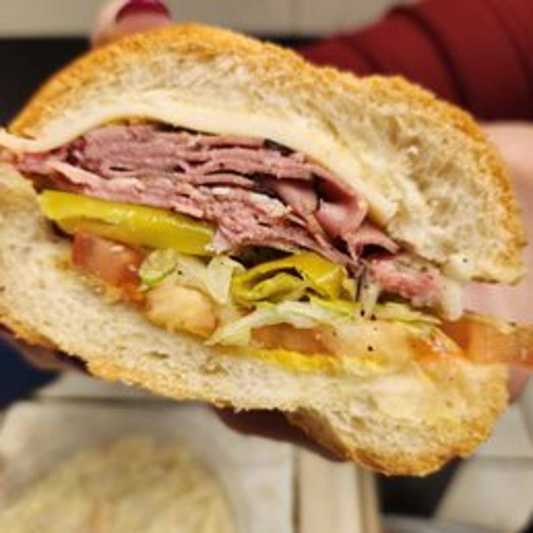 Tender, thinly sliced roast beef piled high on your choice of Italian bread. Served with options like lettuce, tomato, onion, cheese (provolone or Swiss), and your choice of condiments such as mayonnaise, mustard, or horseradish sauce.