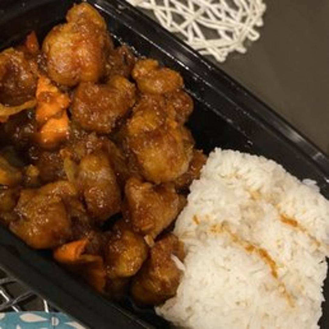Crispy, bite-sized pieces of chicken coated in a sweet and spicy General Tao's sauce, featuring a blend of soy sauce, vinegar, and chili peppers. Served with steamed rice.