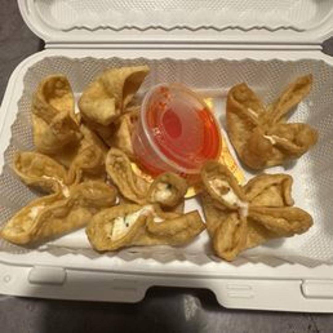 Crispy wonton wrappers filled with a creamy mixture of imitation crab meat, cream cheese, and seasonings, served with a sweet dipping sauce.