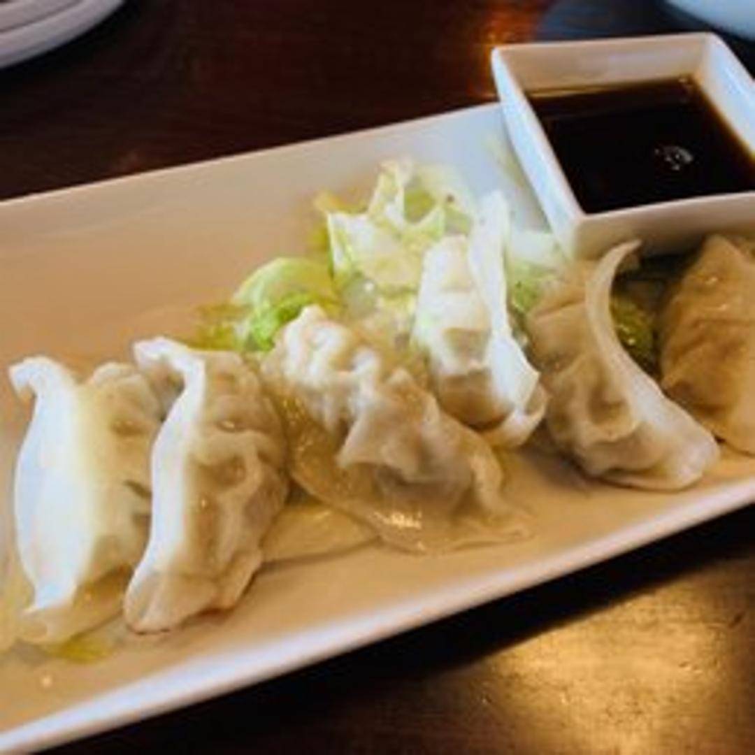 Japanese-style dumplings filled with a savory mixture of ground meat (typically pork), vegetables, and seasonings, pan-fried or steamed and served with a dipping sauce.