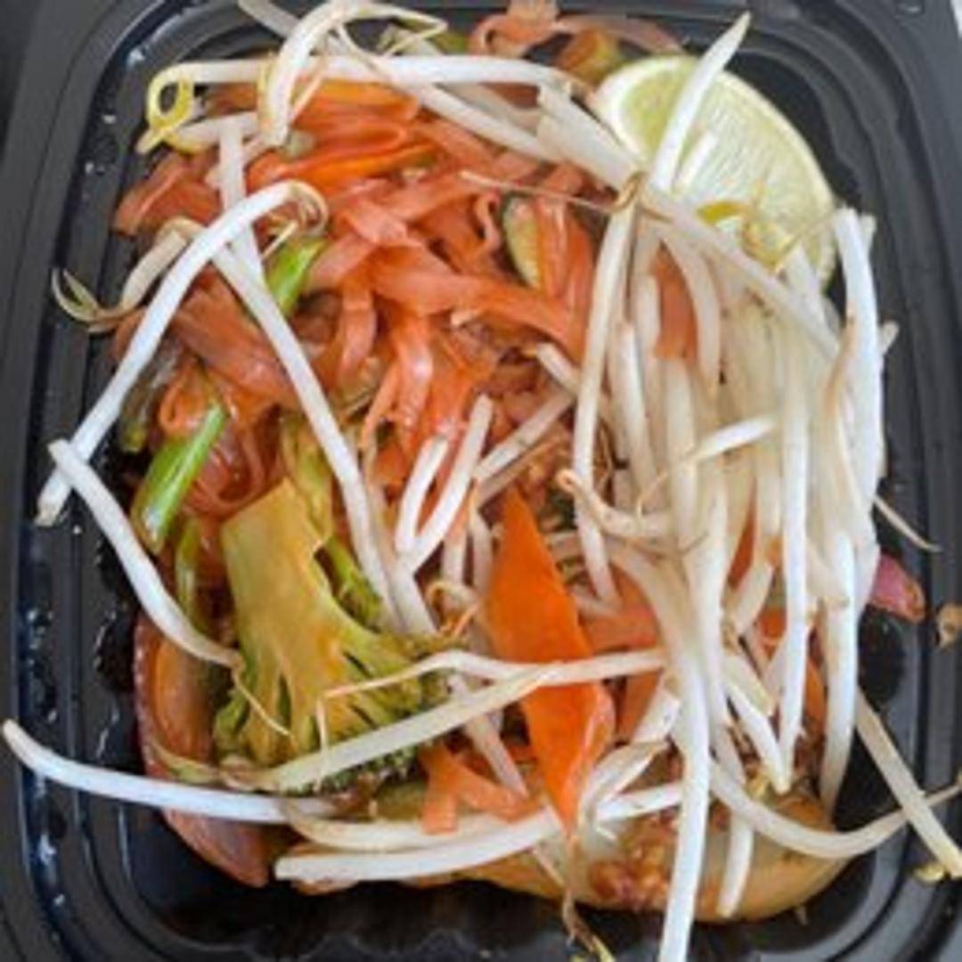 Rice noodles stir-fried with egg, bean sprouts, scallions, and peanuts in a sweet and tangy tamarind sauce, typically served with your choice of protein (e.g., chicken, beef, shrimp, or tofu).