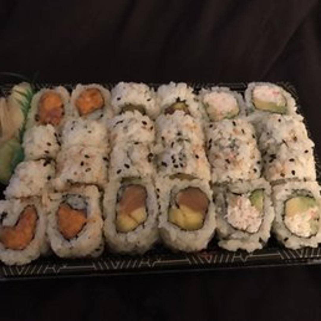 A popular sushi roll consisting of imitation crab meat, avocado, and cucumber. Rolled in sushi rice and nori seaweed, and often sprinkled with sesame seeds.