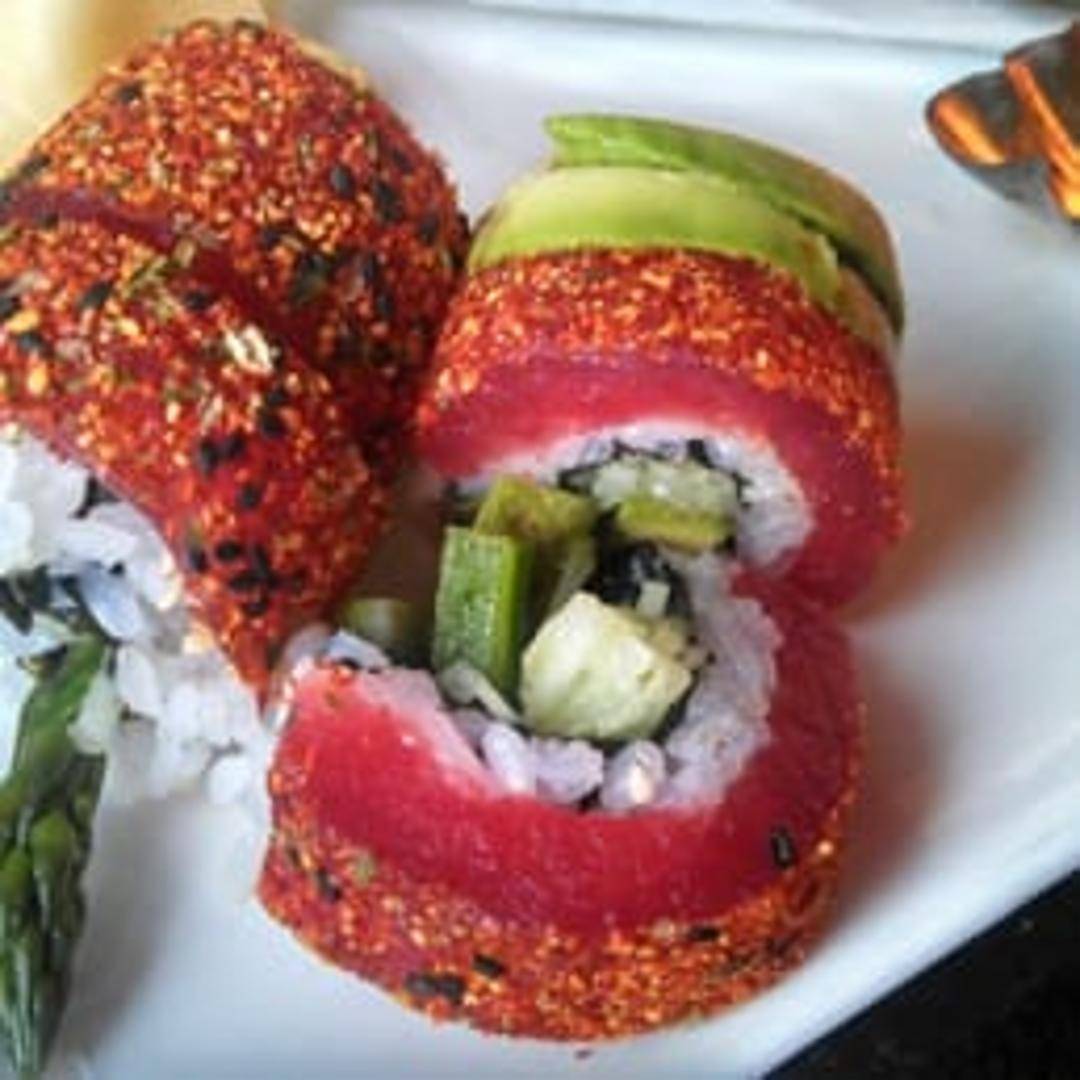A creative sushi roll featuring a variety of ingredients, often including tempura shrimp, crab, avocado, cucumber, and a special sauce. Specific ingredients may vary.