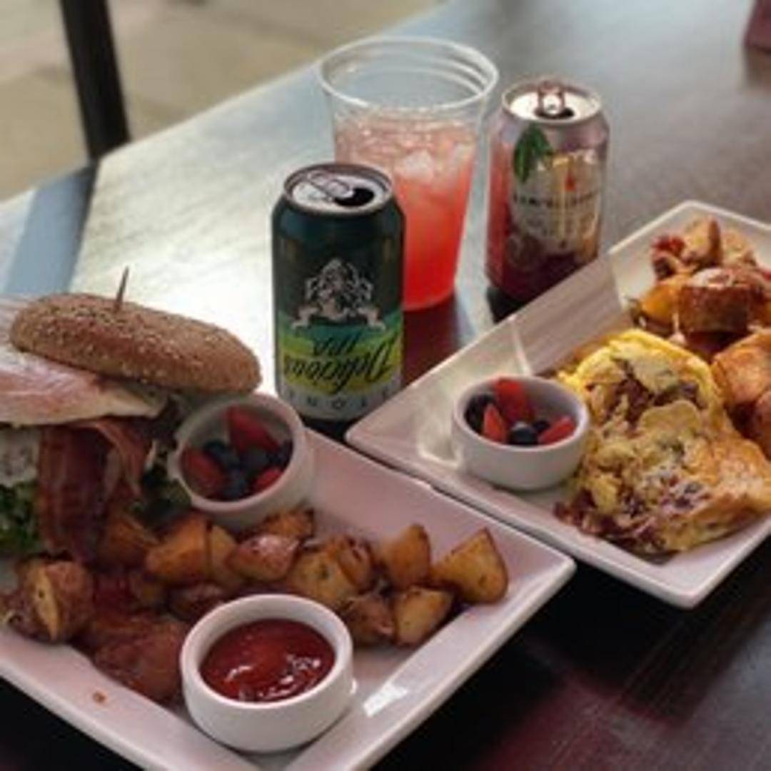 A hearty burger featuring a juicy patty (beef or vegetarian option available), topped with a fried egg, crispy bacon, melted cheese, and a breakfast-inspired sauce on a toasted bun. Includes typical burger toppings like lettuce, tomato and onion.