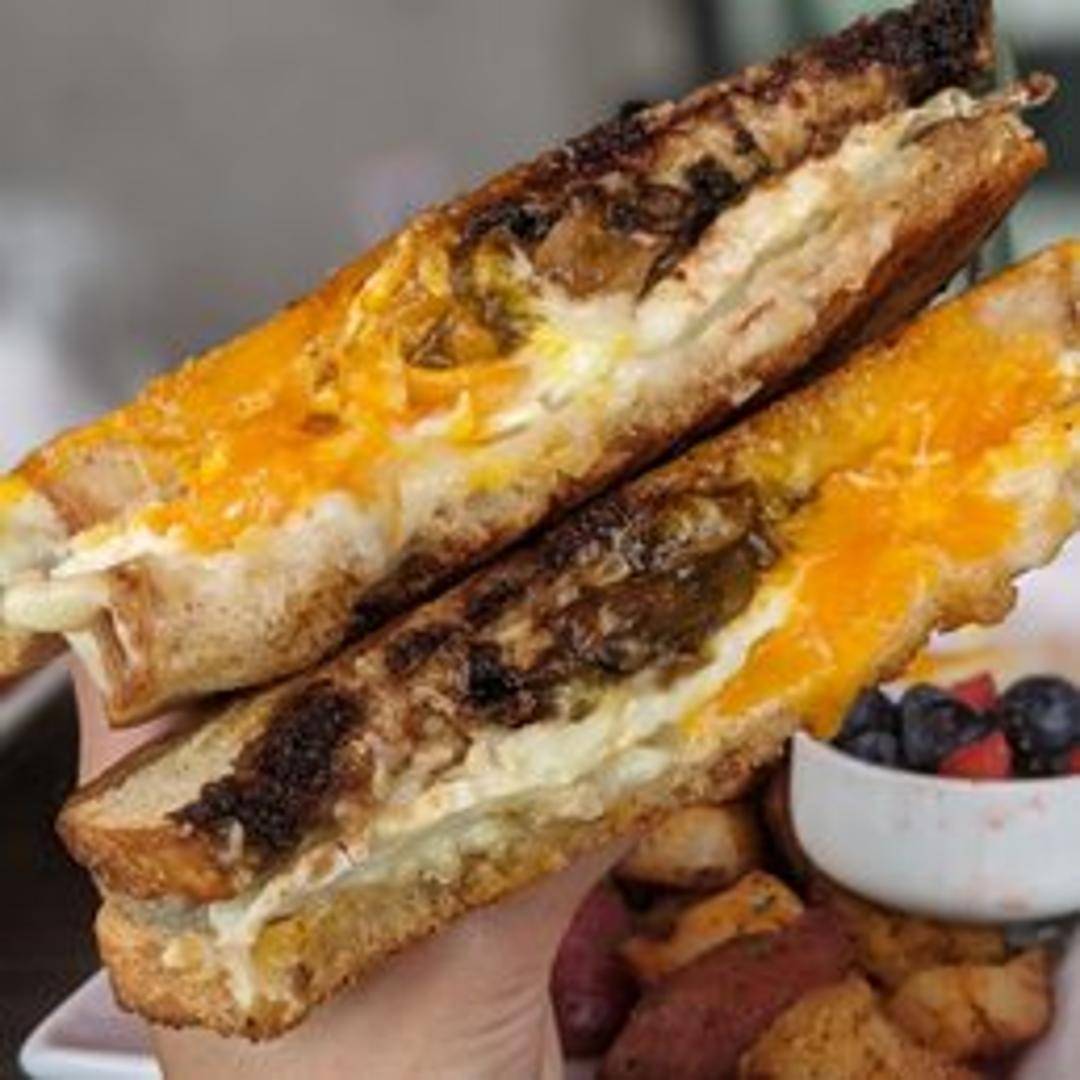 A decadent breakfast sandwich featuring creamy scrambled eggs infused with aromatic truffle oil, nestled between toasted artisanal bread. May include cheese, greens, and a truffle aioli.